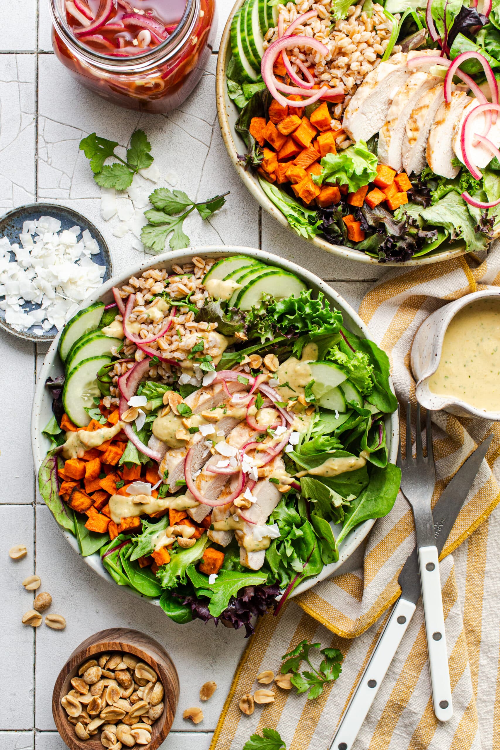 - To assemble: add greens, farro and roasted sweet potatoes to a shallow bowl, then top with chicken, cucumber and a few red onions. Drizzle with a tablespoon or two of the dressing. Finish with coconut flakes, peanuts and additional cilantro.